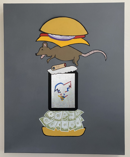 " mishaco burger "two thousand twenty three. 24 x 30 inches . spray paint, acrylic on canvas .
