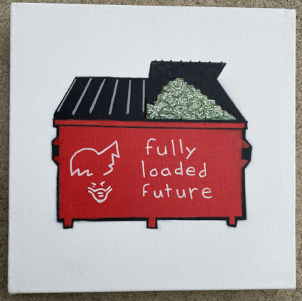 " fully loaded future "two thousand twenty two . twelve by twelve inches . spray paint , acrylic on canvas .