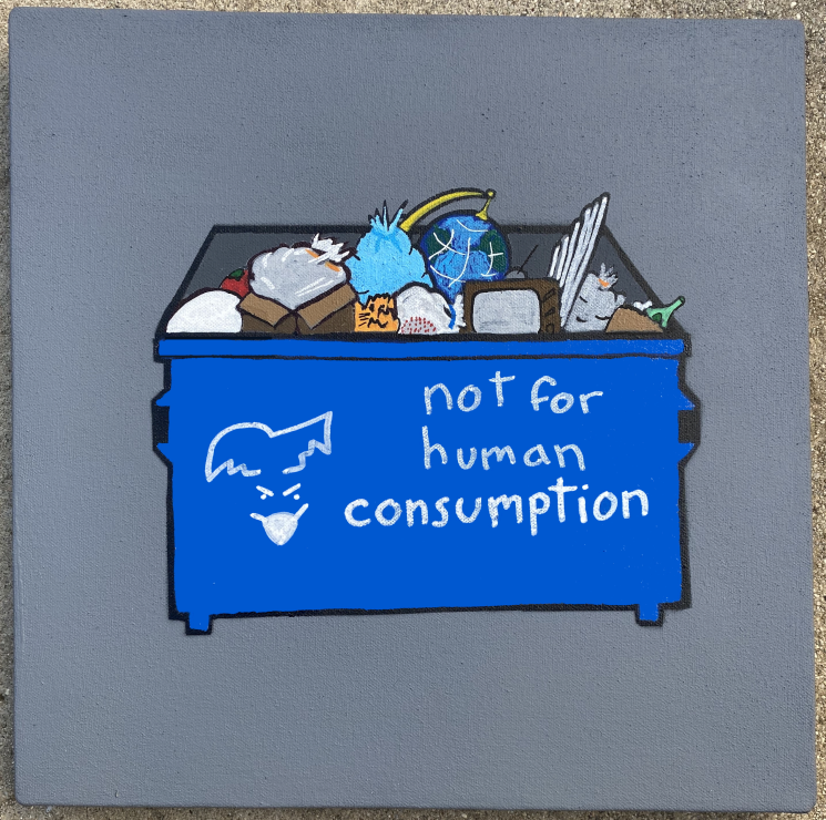 " not for human consumption "two thousand twenty . 12 x 12 inches . spray paint, paint marker on canvas .