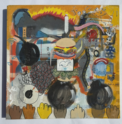 " not for human consumption "two thousand twenty three . 18 x 18 inches . spray paint, acrylic on canvas .