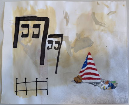 " untitled (flag tent) "two thousand twenty four. 16.75 x 13.65 inches . spray paint, alcohol marker on paper .